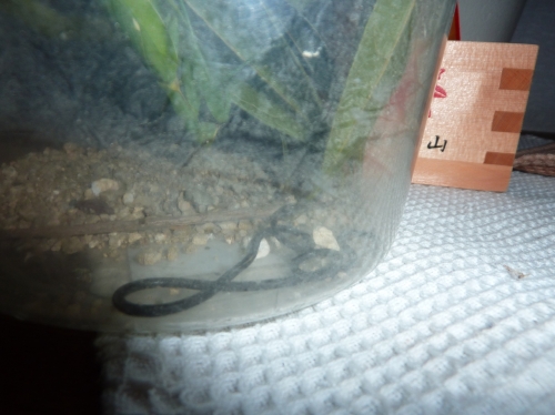 息子のポン太郎が新しいペットを捕獲しました。