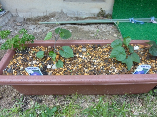 そこで早速、キュウリの次に、夏のある日にビールのお供に足るプランター野菜、ということでナスの苗を買ってきました。