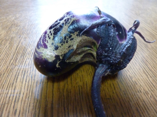 最終目標は焼きなすと秋茄子ですが、今回はちょっと小さいし、ちょっと傷もあるし、朝ごはんのお味噌汁に入れてもらいました。
