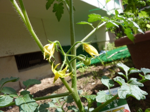 黄色の小さな花を咲かせていたミニトマトの千果ちゃんは、緑色の小さな小さな実を着けました。