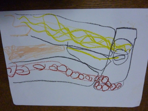 ポン太郎「そう!このあな(黒のクレヨンで描いた横長の長方形)のなかをとおって、このトイレ(縦長の長方形)のなかに、ぶりぶりぶりってたまってるの。」