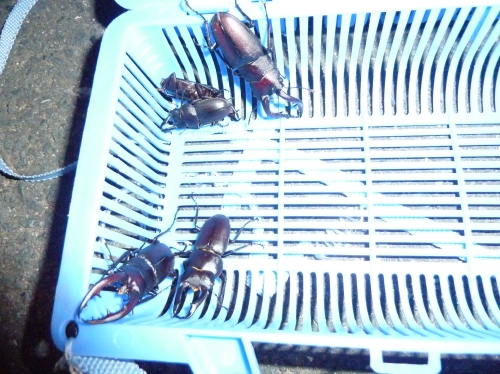午後6時ごろまで採って、ノコギリクワガタのオス2匹、コクワガタのオス3匹。