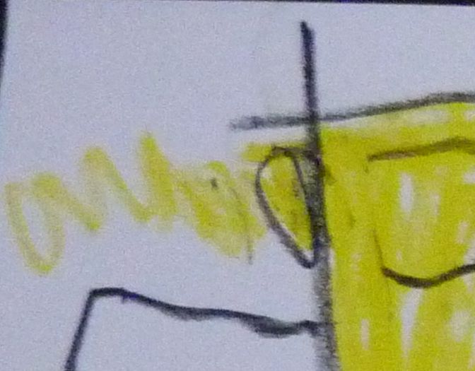 そんで、ドリルの下にヘッドライトがあるんですけど、息子はドリルの上に黄色のヘッドライトを描いているんですね。オリジナルなわけですね。