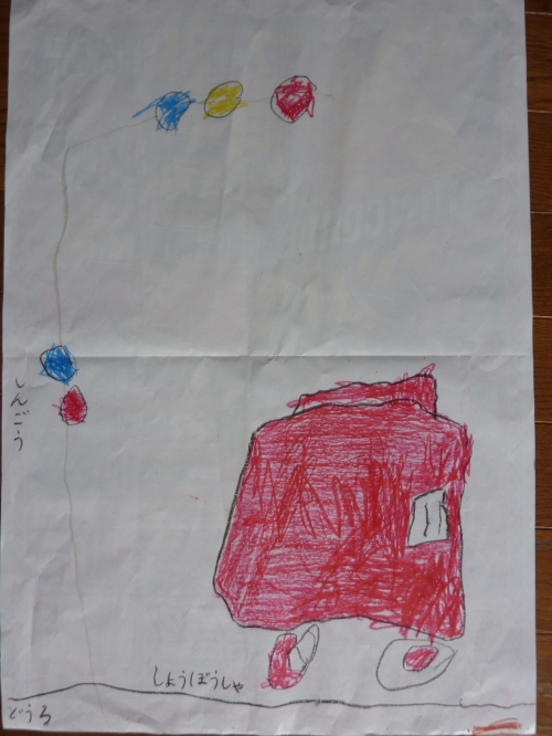 消防章ではない、高所作業車に付いている、簡単な「章」を彼は描いていたのです。