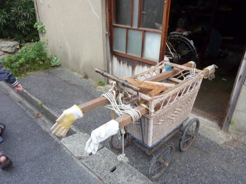 乳母車の中の木切れは「彫り物」(「ほりもん」と読みます。)だそうです。